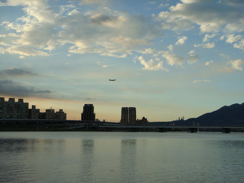 傍晚的天空,天色還亮,有別於外頭下班的擁擠吵雜車潮,淡水河悠雅地、安靜地波動著,偶而可見到即將降落的飛機飛過