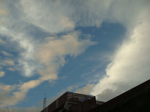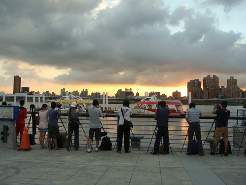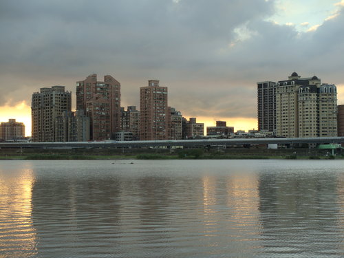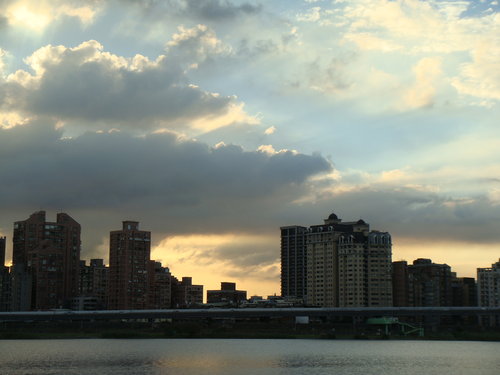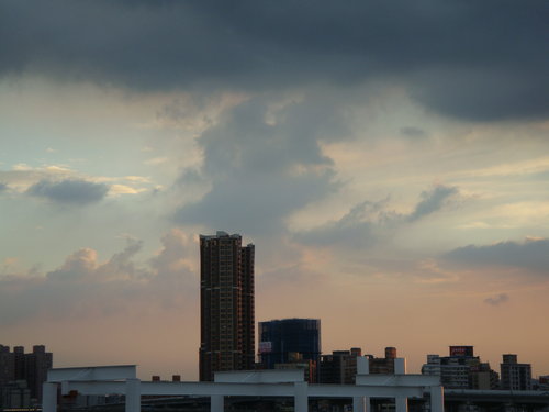 下班時間,穿梭在台北市的都市叢林中,除了車,就是人,忽然抬頭見到像畫布般有著各種色彩的雲,這颱風來臨前夕,會不會有令人驚艷的夕陽美景啊?於是機車一轉,往大稻埕五號水門騎去~~~