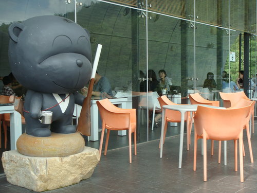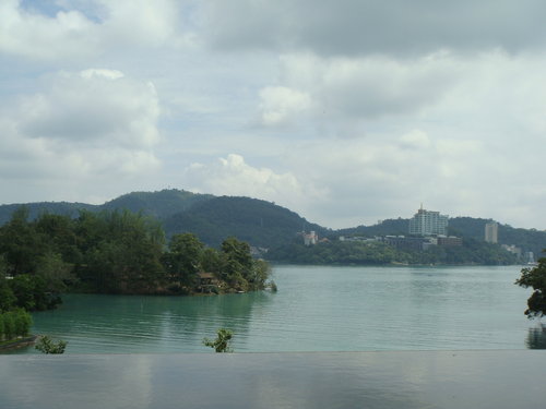 日月潭的湖光山色穿過寬闊的跨距空間,直接映入眼中,建築物的環形造景水池,與碧綠的湖水連成一氣,好迷人喔~~~