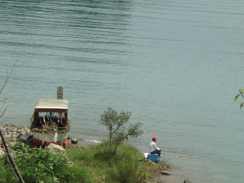 潭邊垂釣的阿伯望著翠綠的湖光山水,在思索著何事呢?