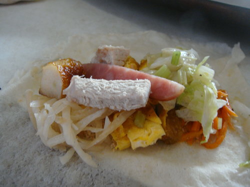 爸比說,要先將潤餅皮打開,灑上花生粉及些許糖粉,再夾上要包的菜