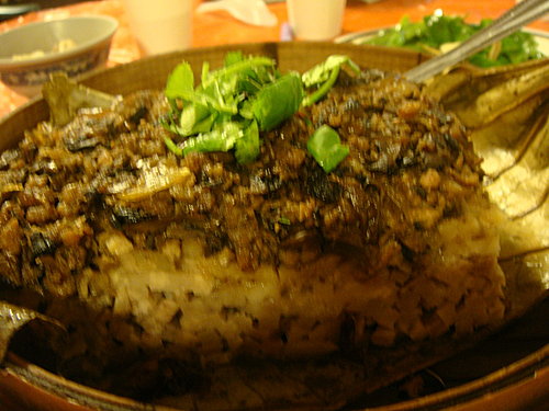 第二名要算是芋香糕了!這是南部口味的芋頭糕,將大甲芋頭切絲,再鋪上香菇肉燥,直接包上荷葉用大火蒸籠蒸五十分鐘。芋絲鬆Q,容易入口,而且肉燥裡的油蔥香,很有古早味。一大籠只要150元,好吃又便宜!(可惜有點拍糊了)