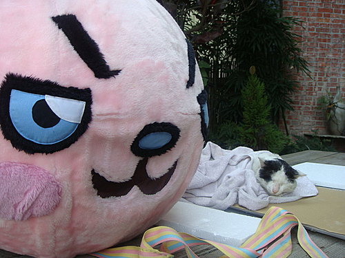 貓咪完全不受來往遊客的干擾,趴睡在大頭兔旁