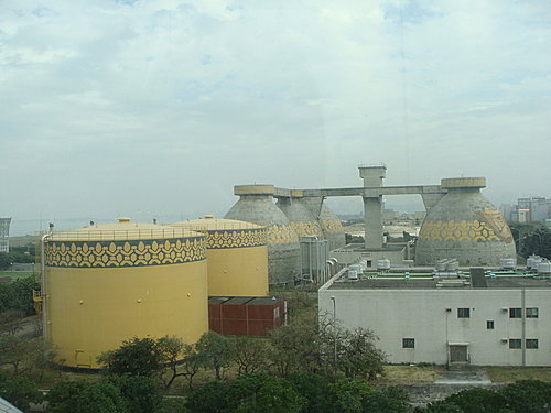 一旁的汙水處理場造型特別,小朋友還笑稱是手榴彈啦!