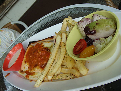 這是兒童餐(也要超過300元),最怪異的是寬板麵,吃起來像棺材板,這會是小朋友喜歡的菜色嗎?一般的義大麵應該才是小朋友喜歡的吧?
