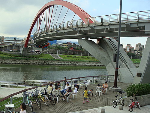 在落日餘暉中迎著風,追著夕陽,看你是要全家人出來散步、還是情侶浪漫漫步、亦或者獨自發呆,都是個不錯的地方!聽說晚上7:00後,河畔和橋的投射燈光會全開,投射燈綻放的光芒更突顯紅色拱形橋樑的美侖美奐。從黃昏日落到夜幕低垂,靜靜地看這大地天色的變化,必定是種享受囉!下回要再去看看夜間彩虹橋的美麗!