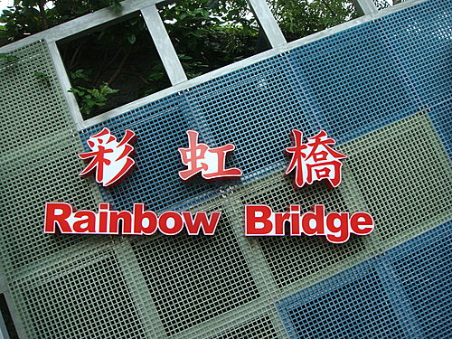 彩虹橋位於基隆河畔,一端通往內湖新民路(成美河濱公園)方向,一端通往饒河街夜市,不論是徒步健行或騎乘單車,可隨意在兩岸河堤穿梭,內湖的居民到饒河街逛夜市超方便的呢!