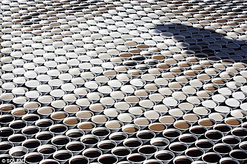 Artist assistants stand next to 3,604 cups of coffee which have been made into a giant Mona Lisa in Sydney , Australia . The 3,604 cups of coffee were each filled with diffe! re! nt amounts of milk to create the different shades!