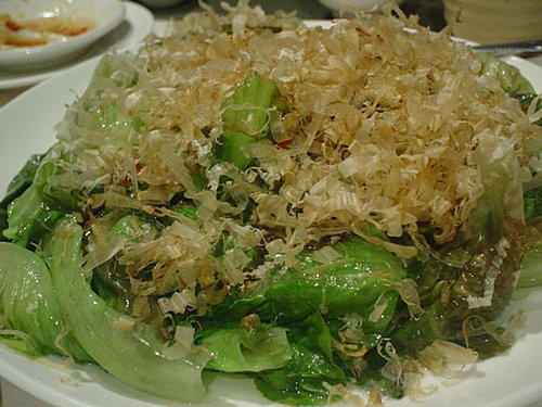 每日時蔬,這道是淋上蠔油的川燙大陸妹,上面放了會舞動的柴魚,因為沒拌勻,有時會吃到很鹹的部分,有點扣分!
