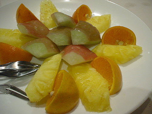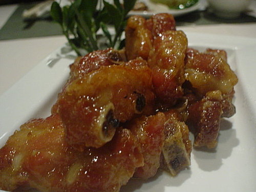 橙汁香檳骨,炸的香酥的豬肉裹上甜酸的橙汁,吃起來還挺不錯的!