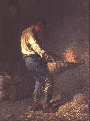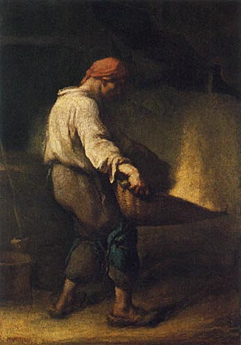 米勒最早在1848年時繪製,寫農夫拿著畚箕使勁搖晃篩選小麥的過程,麥子翻飛時塵土飄揚的效果如此逼真,令人看了不禁想打噴嚏呢!後來這件作品下落不明,於是米勒在晚年時期,再次重新繪製了相同的主題,奧塞美術館收藏的正是晚年米勒重繪的版本。