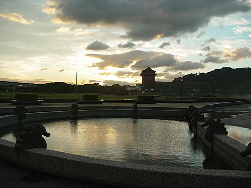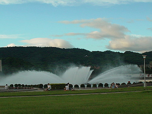 偌大的河濱公園最具特色的景觀,莫過於這「希望之泉」了,「希望之泉」於民國86年正式啟用,可算是台北地標之一,但它不是無時無刻都可見到噴如此高的噴泉喔!這天Holly很幸運地,補捉到颱風天夕陽中所形成的噴泉瀑布,噴泉因著風的吹襲,往左延伸形成瀑布狀,再加上夕陽餘暉的映照,形成美麗的畫面,只可惜時間已6:00多,天色已稍暗,拍不出那份美!