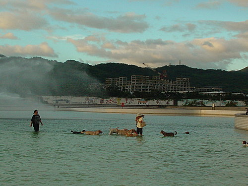 夕陽時分,噴泉旁總會聚集一些狗友們來戲水,瞧牠們不時用短短的腿努力游泳、不時奮力去撿回主人丟出的飛盤,諸般可愛的模樣,看著~看著~臉上不自覺地充滿了笑意…