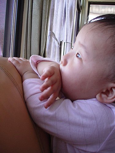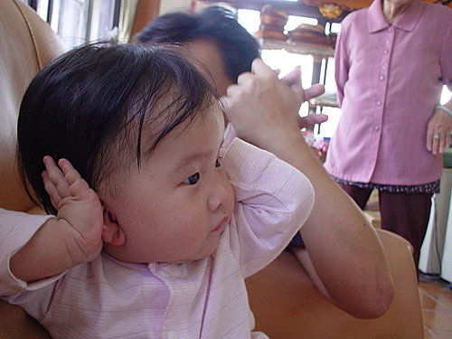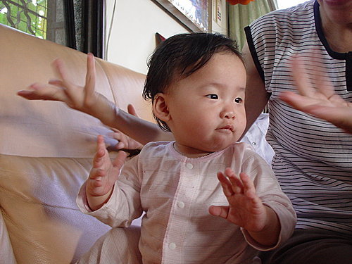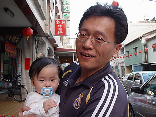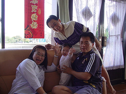 粉奇怪喔!除了爸爸及媽媽外,她只給叔叔抱抱!不知叔叔有那麼大的魅力?(呵!呵!我想~是愛耍酷的叔叔也被她征服了吧!)~~阿公及阿嬤都要吃醋囉!