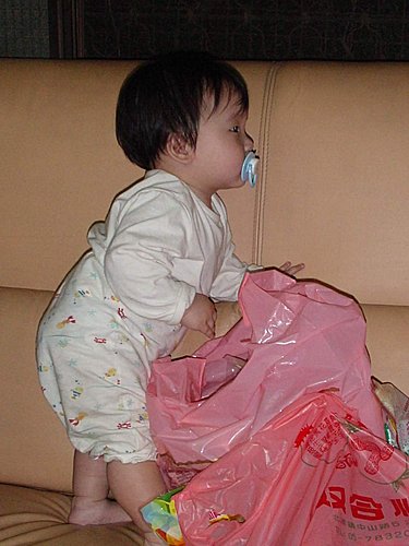 看到買回來的一堆伴手禮,小宣變得很忙碌,每個袋子都要去翻翻看!
