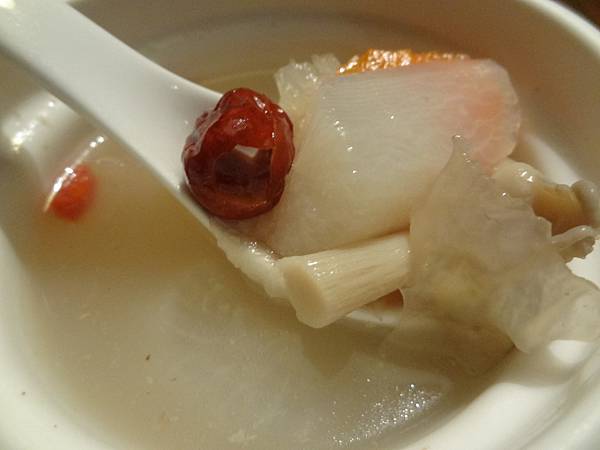 餐前湯,以雞骨為底,加上蘿蔔、枸杞、紅棗等敖煮,湯頭清爽而甘甜,只是,還沒吃到主餐,都已七分飽了!