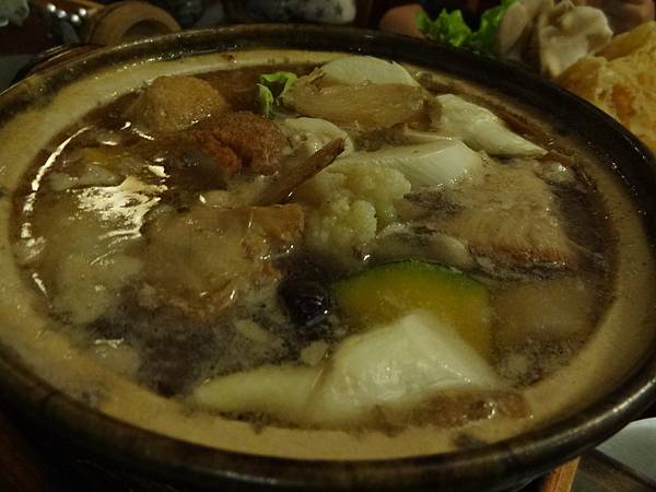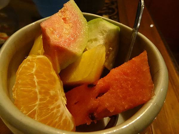 飯前水果,以不小的陶盅裝上了鳳梨、西瓜、橘子,芭樂、紅心芭樂,因為水果最容易消化,故水果安排在飯前吃!