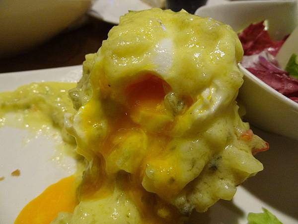 半固體的蛋白蛋黃,刀叉輕輕一劃,香醇的蛋液就沾滿下層的麵包,搭上滑順的塔塔醬,完美的剛剛好!