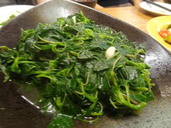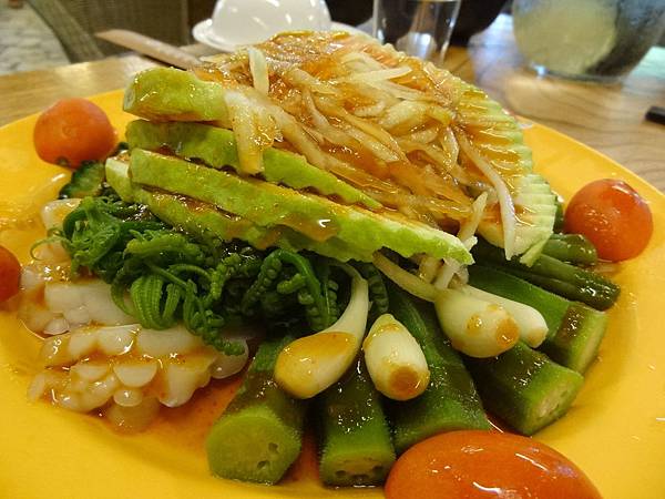 必點菜色1「野菜拼盤」,山蘇、蕃茄、芭樂、箭筍、哈密瓜、蘭花...等15種摘採自曠野溼地的野菜,豐富的色彩不只滿足了視覺,甘苦酸甜辣同時在口中綻放,味覺同樣豐富,尤其是高纖低熱量兼顧營養的食材,吃起來完全不會有負擔。