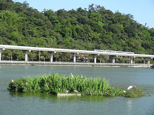 輕風拂面,湖中的鳥兒棲息著,與呼嘯而過的捷運,呈現了動與靜的拉踞