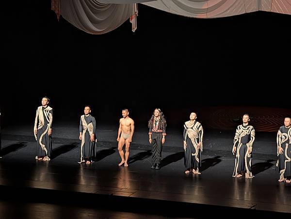 舞台設計了一大片蓋滿舞台的布,隨著8個吊點升降,如同山巒高低起伏,布面上以古拙筆法繪製的人身形,表達身體的協調。